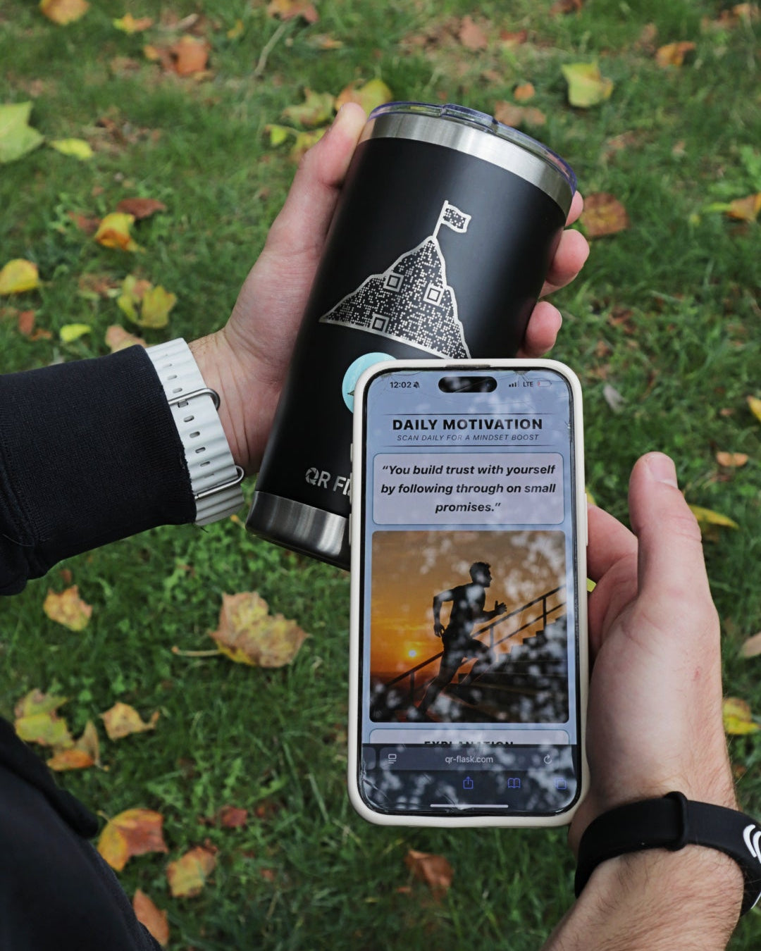 Each QR Flask has a printed QR code. Open your camera, scan the code, and tap the link to view your daily digital content on any smartphone.